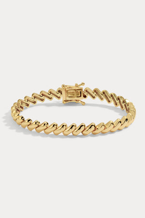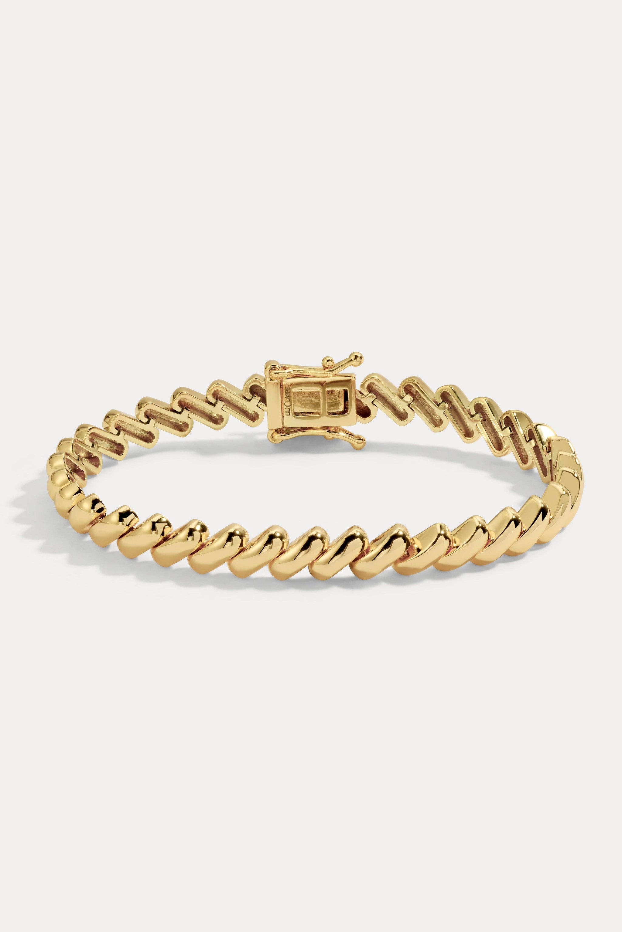 A sleek slanted-link bracelet that feels bold yet wearable. The ultimate stack piece.