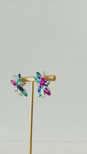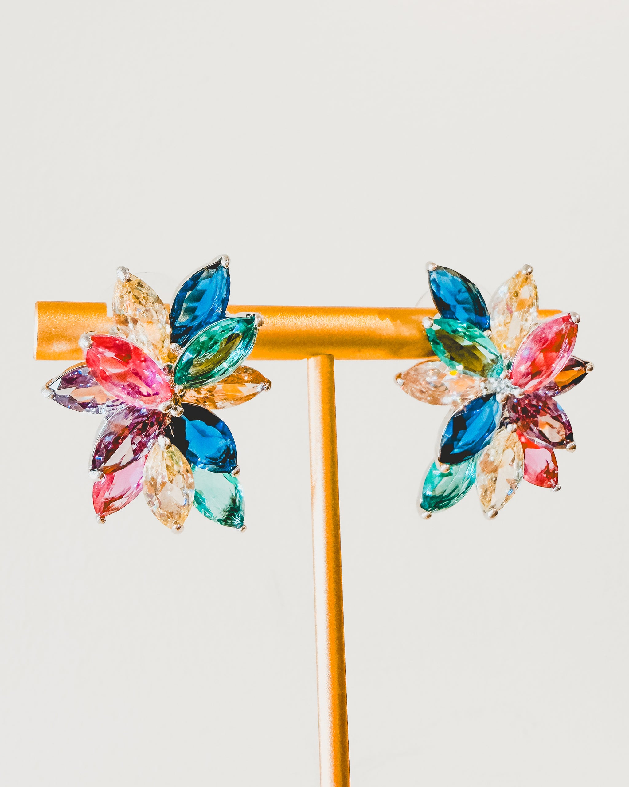 Brighten your day with these playful earrings featuring sparkling crystal clusters in cheerful rainbow hues. Their lively design adds a fun pop of sunshine to any outfit, perfect for those who love a little sparkle with a sunny twist!