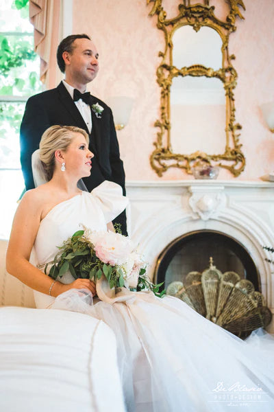She came in thinking that she wanted to have a sweetheart, strapless top, but happened to spy one of our day dresses with a draped detail at the shoulder. "I want that!" she said, and we were off! Working with Michelle was such a pleasure! She trusted the process, but asked lots of questions along the way, which helped us give her a dress she would love. I'm blown away by the final result and am so glad that we were able to be a part of such an important and beautiful day!