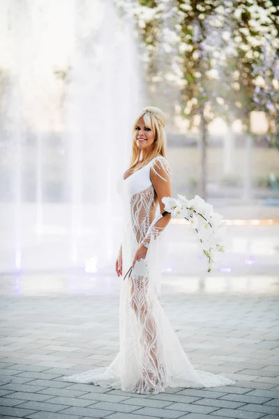 Amy's custom, rocker chic lace wedding gown fit her like a glove. We sourced her beaded abstract lace from Germany. We wanted a lace that had a bit of an edge and wasn't a traditional floral motif. She ended the night in a webby French lace jumpsuit with a white satin, floor-length coat. Match made in rock star heaven.