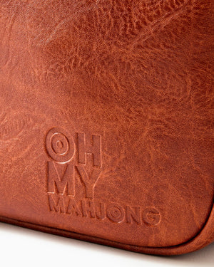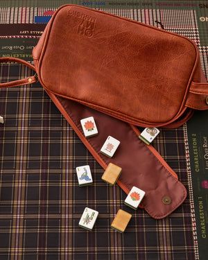 Introducing the Heritage Tile Bag—a rugged and refined storage solution for your mahjong tiles. Crafted from high-quality vegan leather in a rich cognac colorway, this bag is built to endure and designed to impress. Resembling a classic dopp kit, it combines practicality with a timeless sense of style. With sturdy construction and a sleek, masculine look, the Heritage Tile Bag ensures your mahjong tiles are always organized and ready for action. The durable zipper and reinforced stitching make it a dependable companion for every game night.